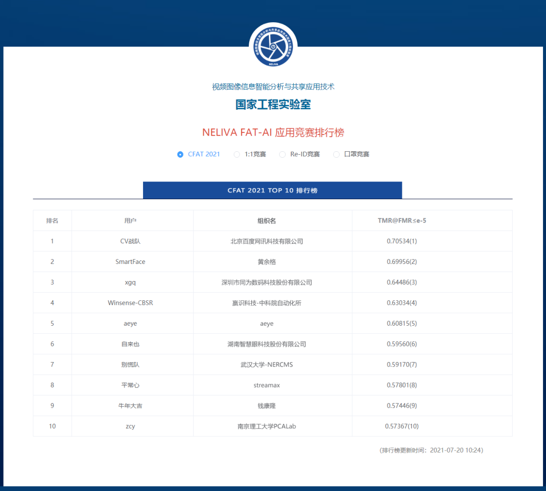CSIG FAT-AI 2021开放场景口罩人脸识别挑战赛(简称CFAT 2021)是由中国图象图形学学会和视频国家工程实验室(NELIVA)共同主办的针对口罩遮挡的人脸1:1测试,已于7月底结束,现公布TOP 10排行榜,颁奖活动将在第十一届国际图象图形学学术会议(ICIG 2021)上举行(因疫情原因暂时延后)。本挑战赛的主旨:打造公正、开放的国家级AI赛道,以专业测评推动人脸识别技术的创新及应用。